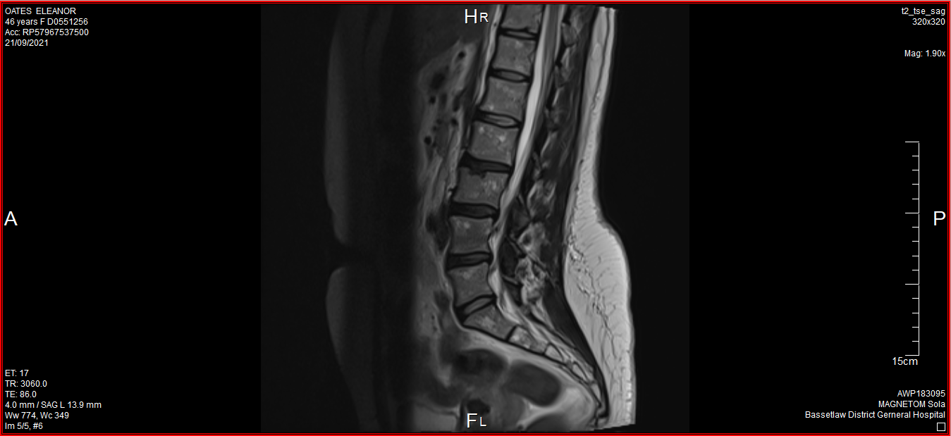 The above image has been taken from the latest MRI scan completed in September 2021 showing three of the desiccated discs.